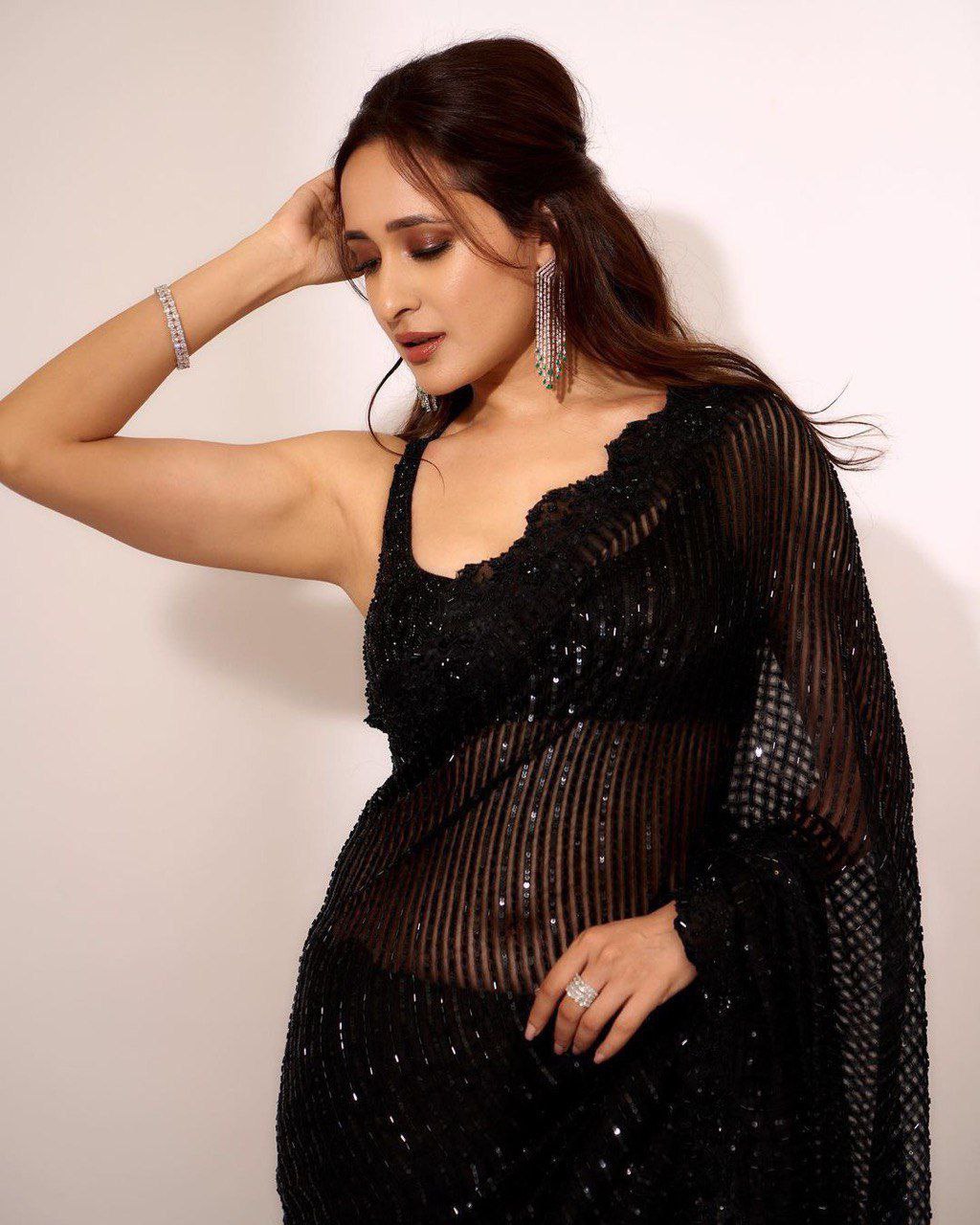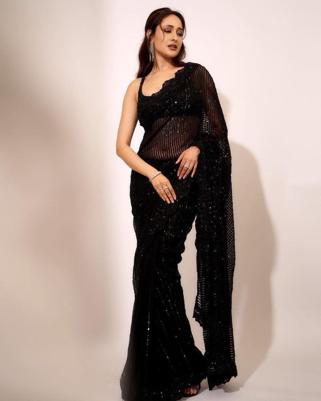 This stunning saree is inspired by the glamorous outfits worn by Bollywood stars. The saree is made of georgette, a light and flowy fabric that gives a graceful look. The saree has a 5 mm seqwance work all over, which creates a dazzling effect. The saree also has a cut work border, which adds a touch of elegance. The saree is 5.50 meters long, and can be draped in various styles. The blouse is made of daimond silk, a shiny and smooth fabric that complements the saree. The blouse has a seqwance work on the front and back, which enhances the beauty of the outfit. The blouse is 1 meter long, and can be stitched according to your preference. This saree is a perfect choice for any party, wedding, or festive occasion. Pair it with some matching jewellery and accessories to complete your Bollywood look.