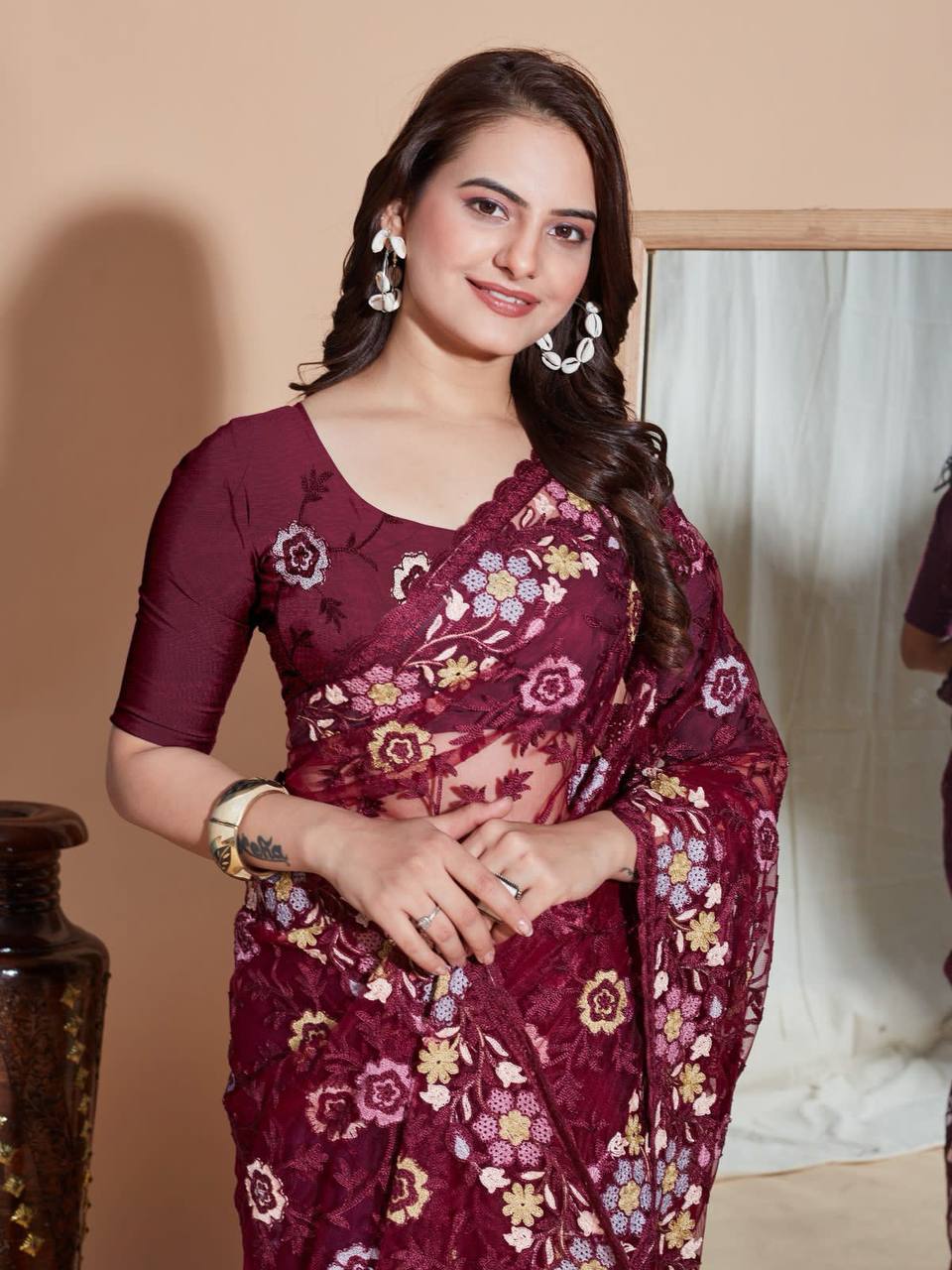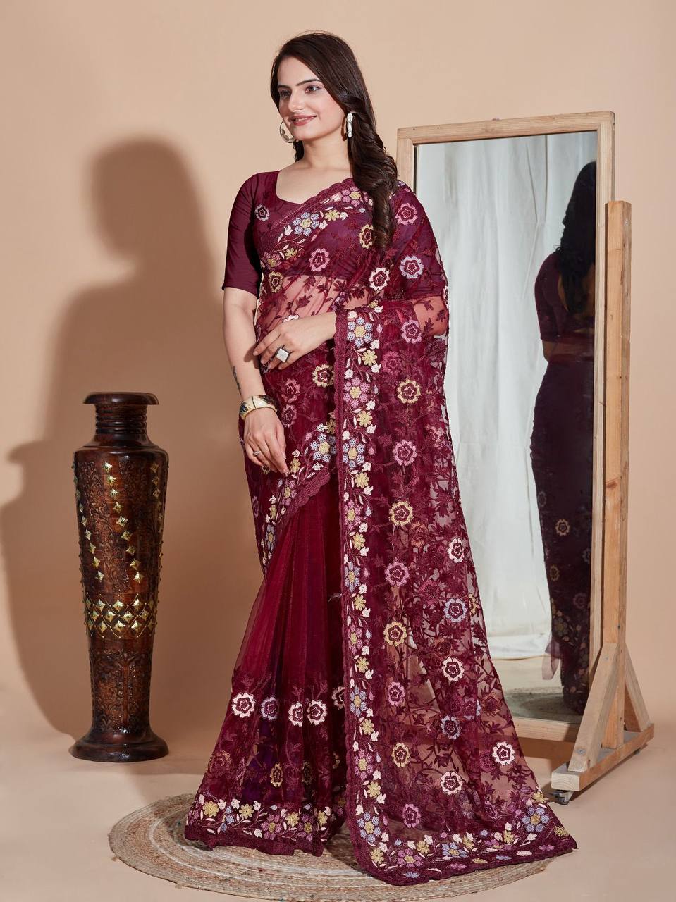 Looking some one for this same colour beautiful Designer Saree on *Soft Butterfly Net* fabric & Embroidery work and whole sarees embroidery work butta and fully embroidery and sequence work blouse