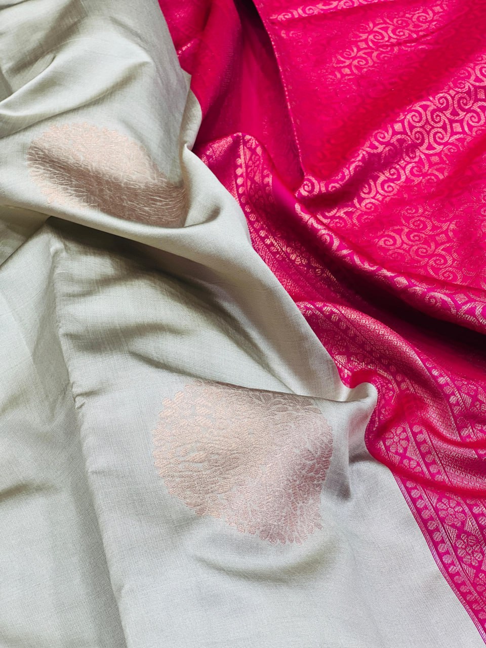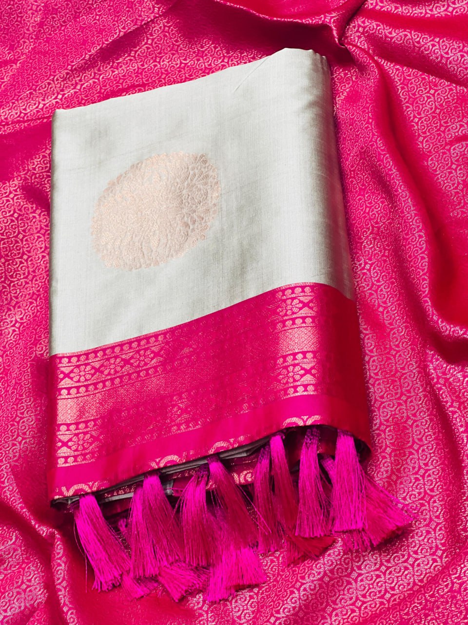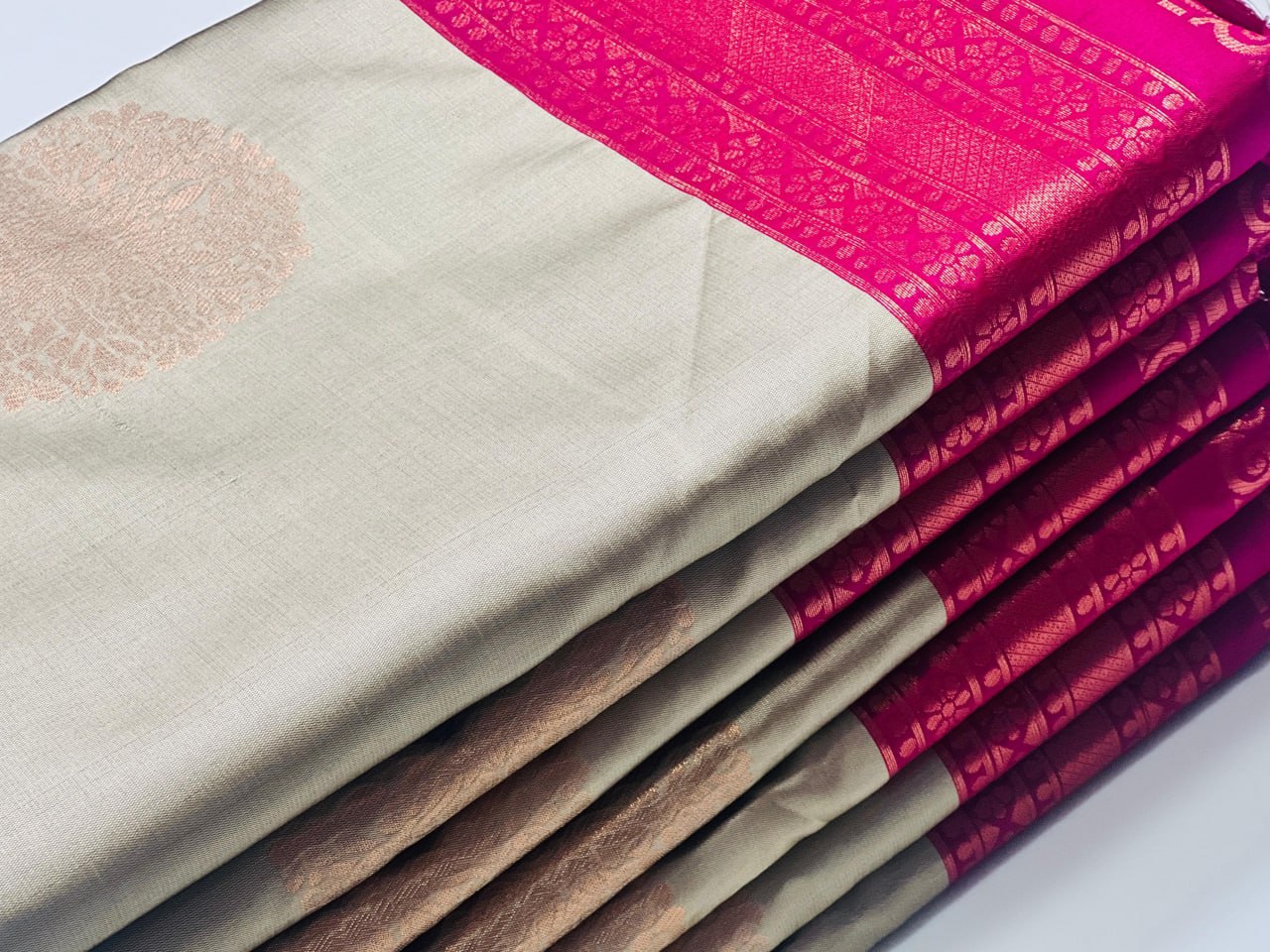 Designer banarsi handloom in kanjiavaram kubera silk concept with contrast pallu border and designer brocade blouse