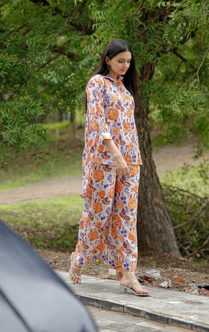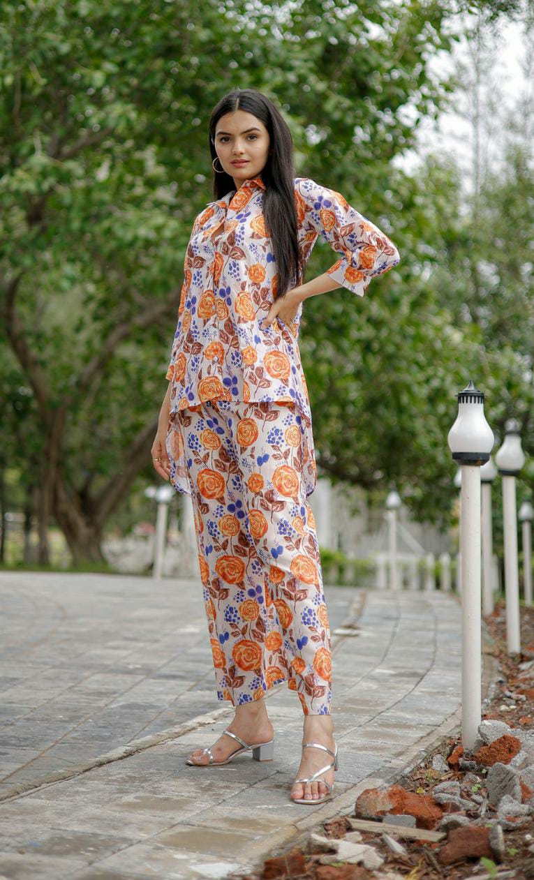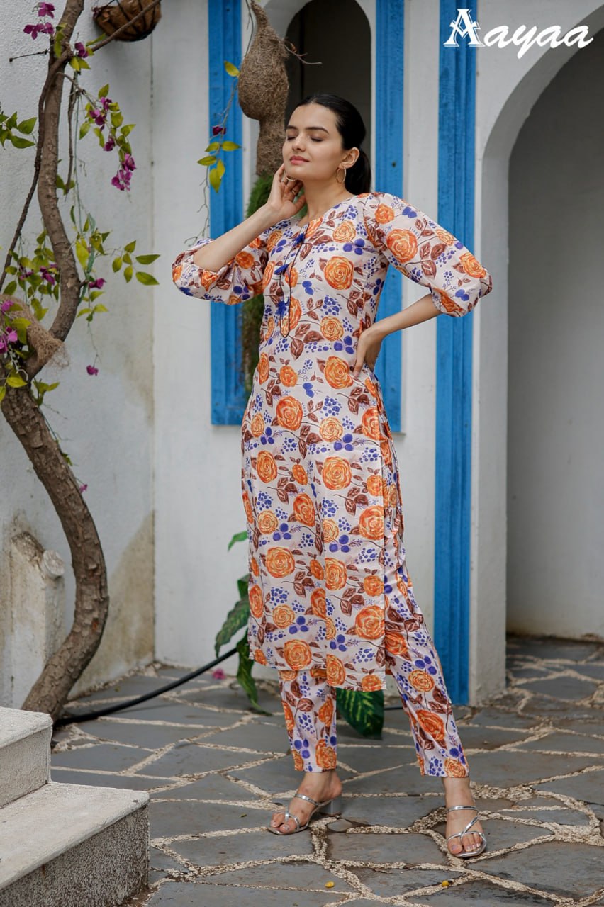 Digital Printed Muslin Cotton Straight Kurta Set in Off White and Orange