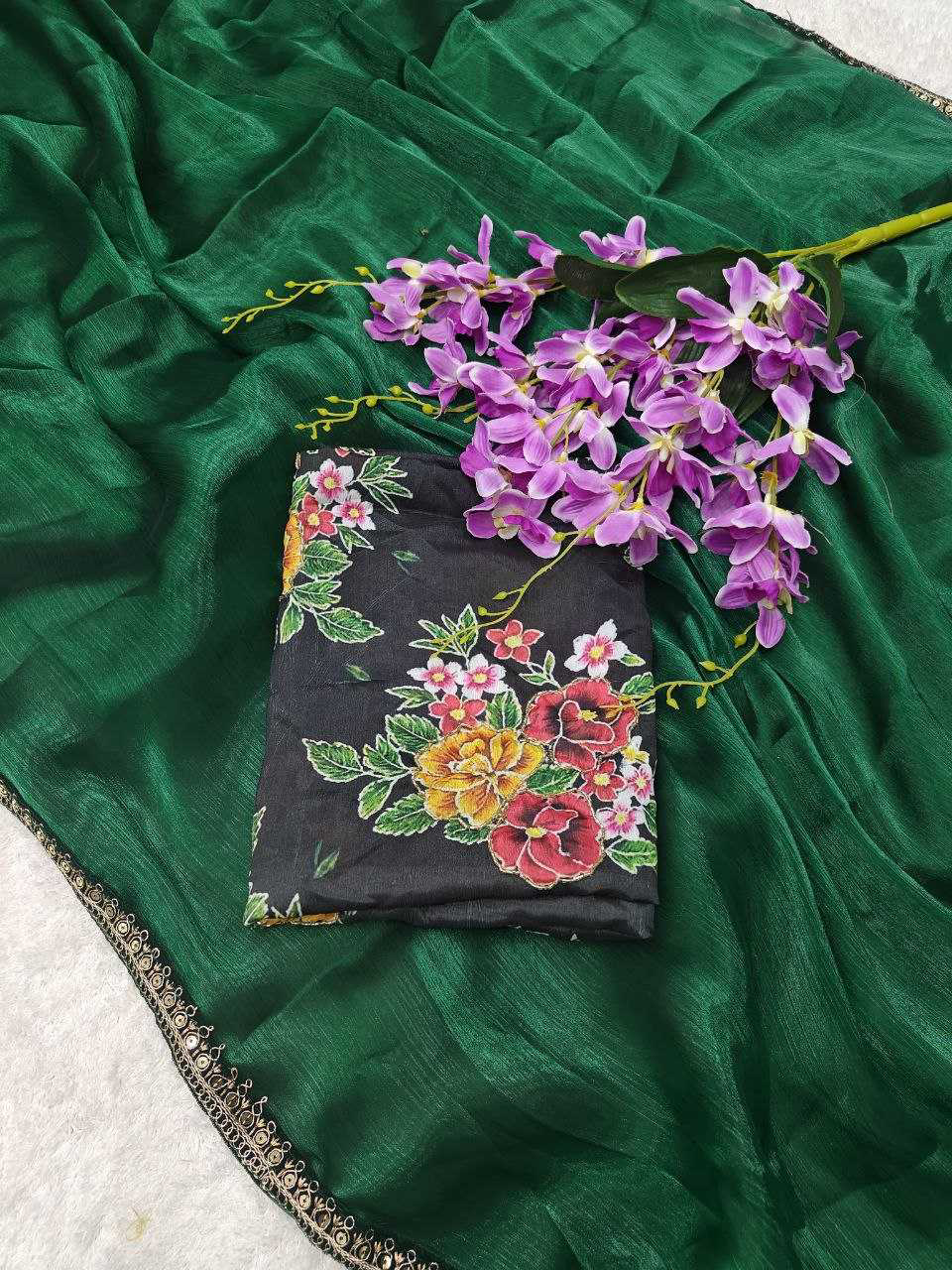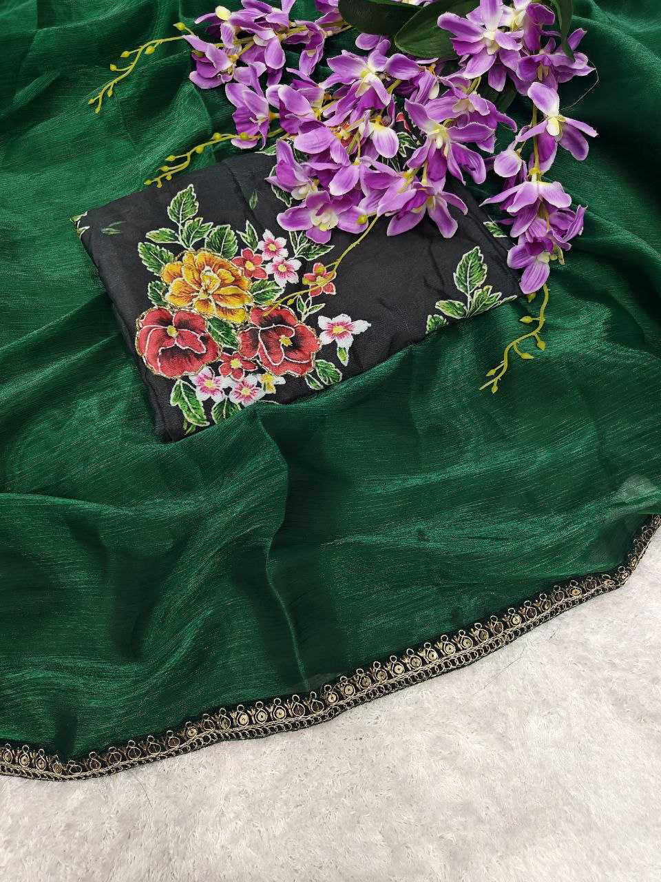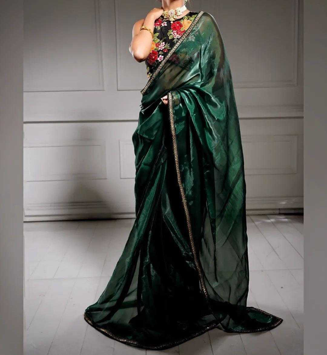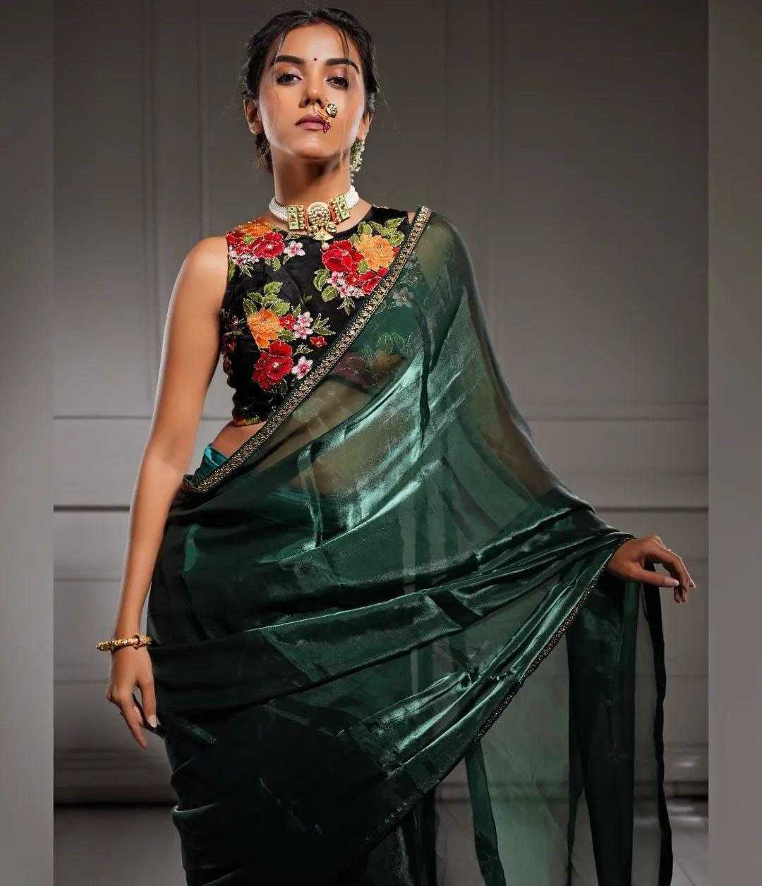 *Descriptions :* Soft Rich Jimmy chu Silk Fabric Along With Designer Coding & Sequence Work Lace Border Along With Designer Print & Khatali Work Rich Blouse Unstich Blouse