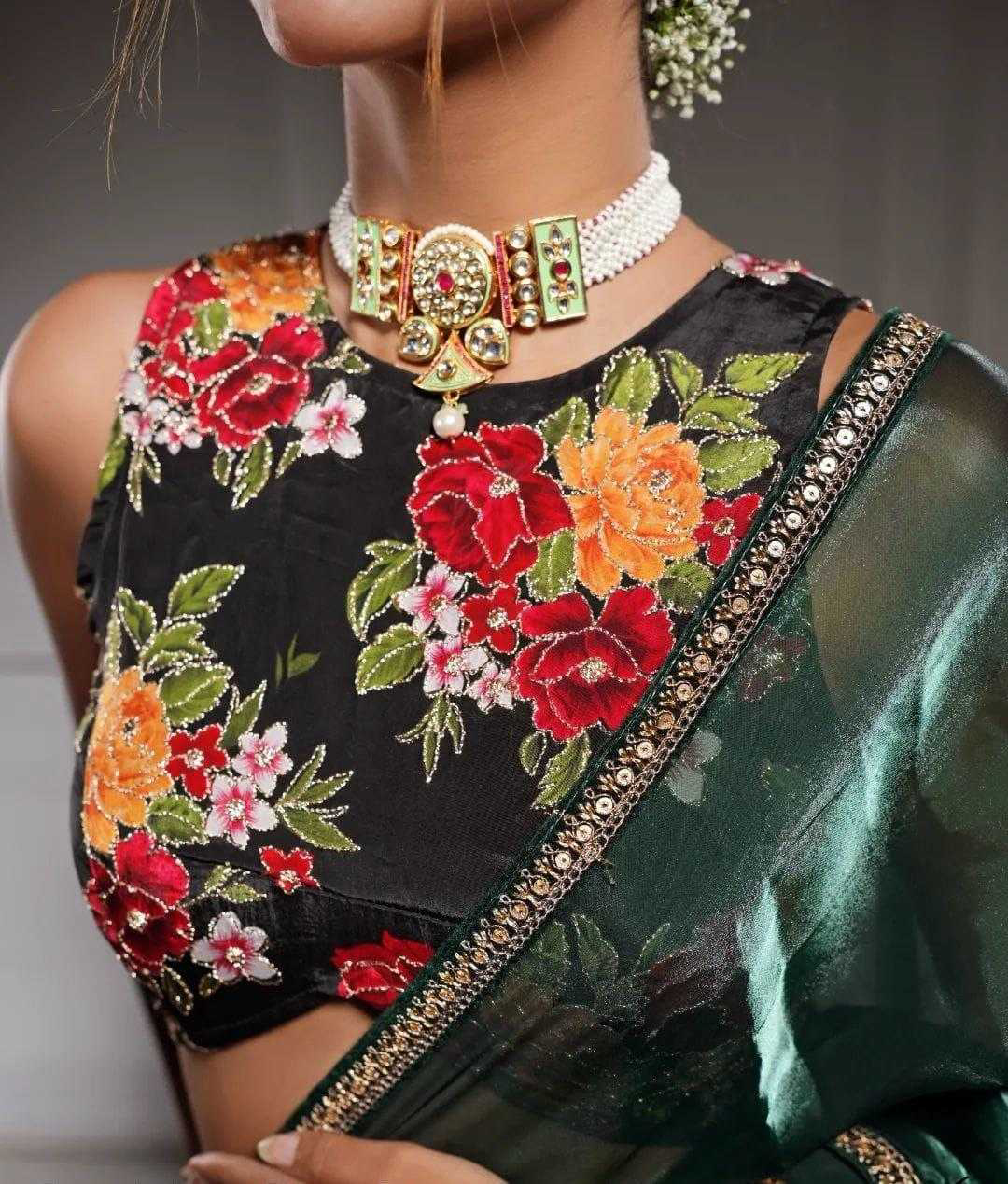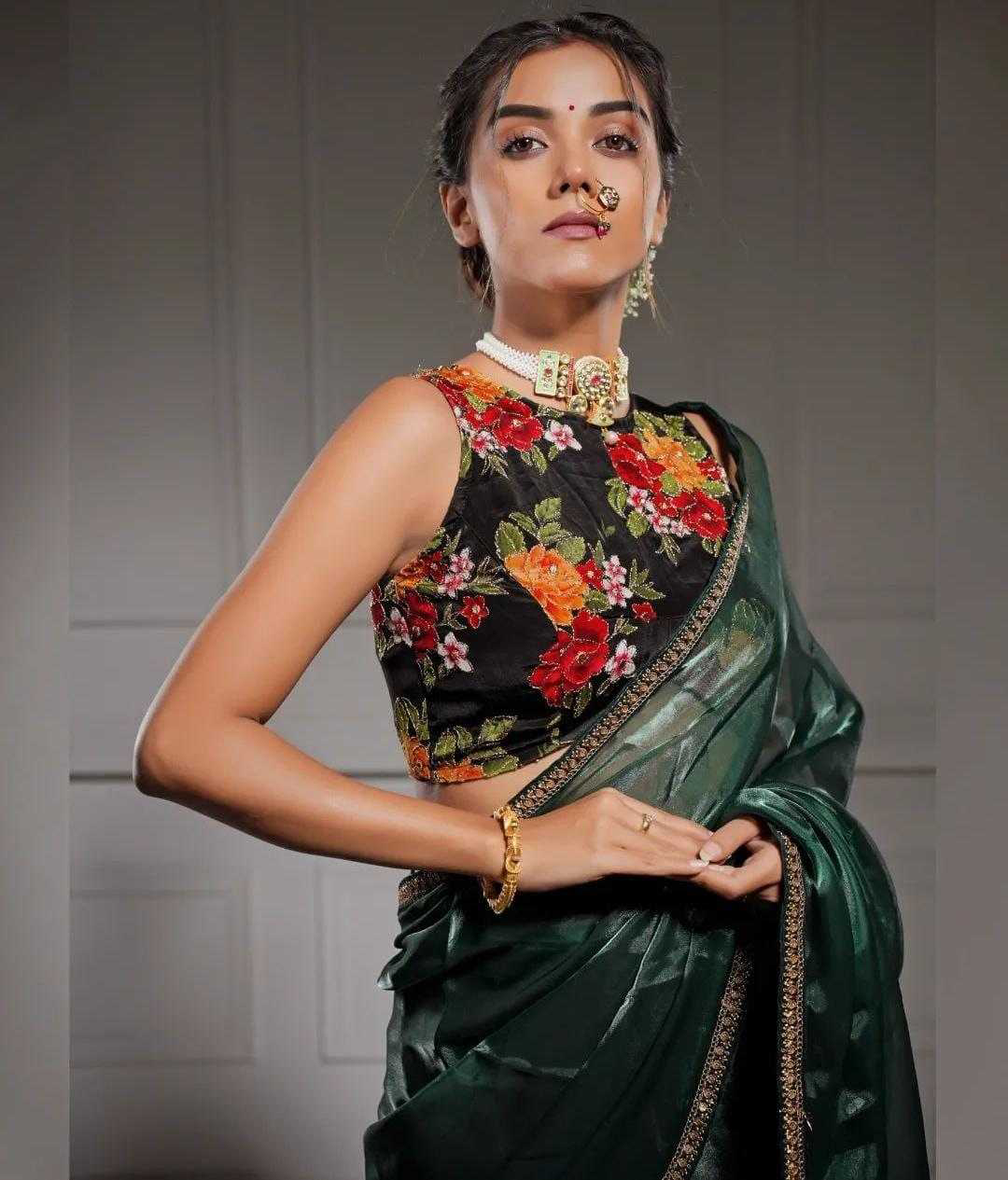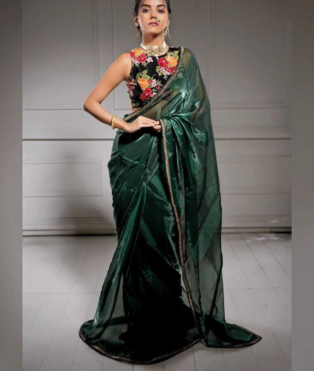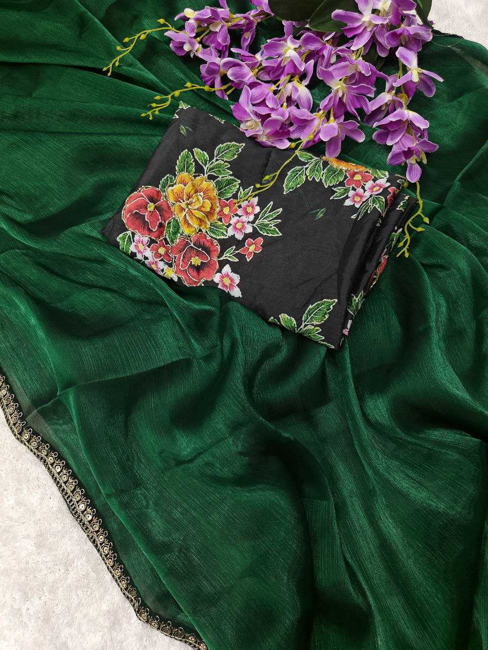 *Descriptions :* Soft Rich Jimmy chu Silk Fabric Along With Designer Coding & Sequence Work Lace Border Along With Designer Print & Khatali Work Rich Blouse Unstich Blouse