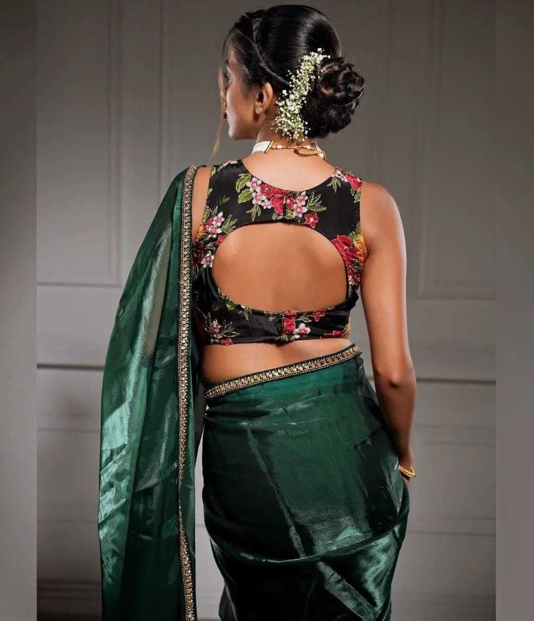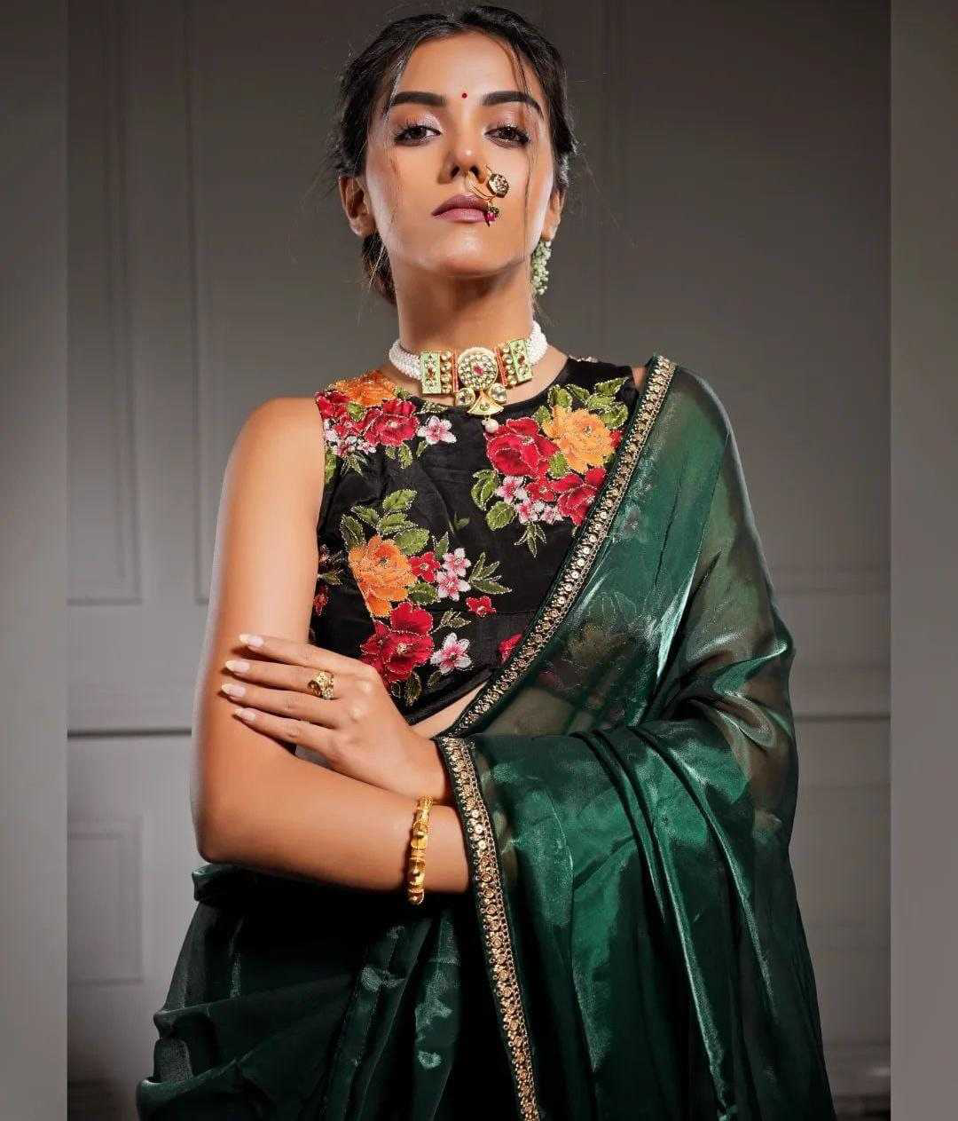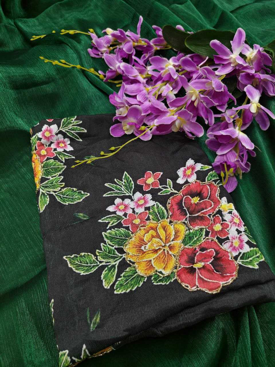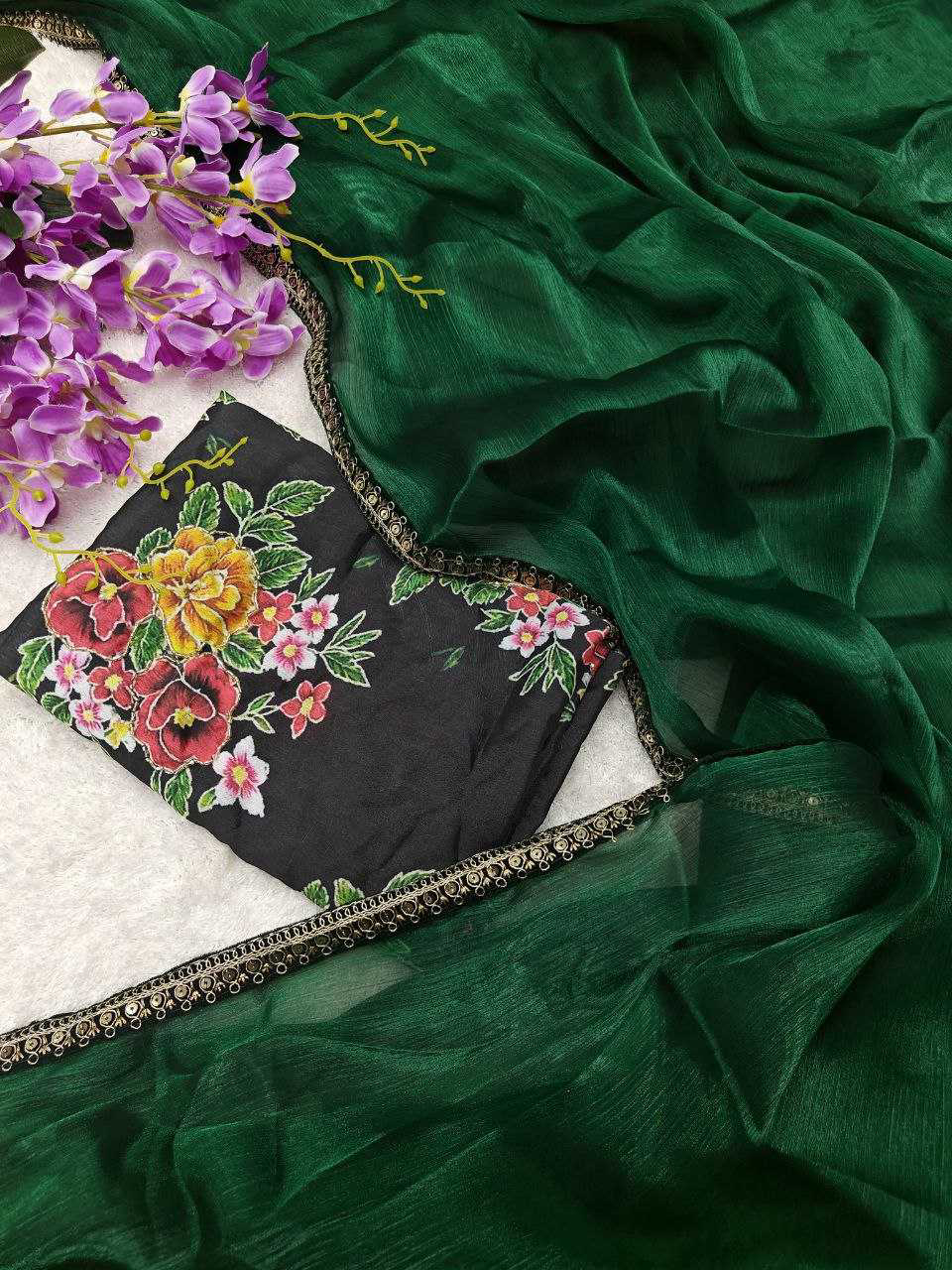 *Descriptions :* Soft Rich Jimmy chu Silk Fabric Along With Designer Coding & Sequence Work Lace Border Along With Designer Print & Khatali Work Rich Blouse Unstich Blouse