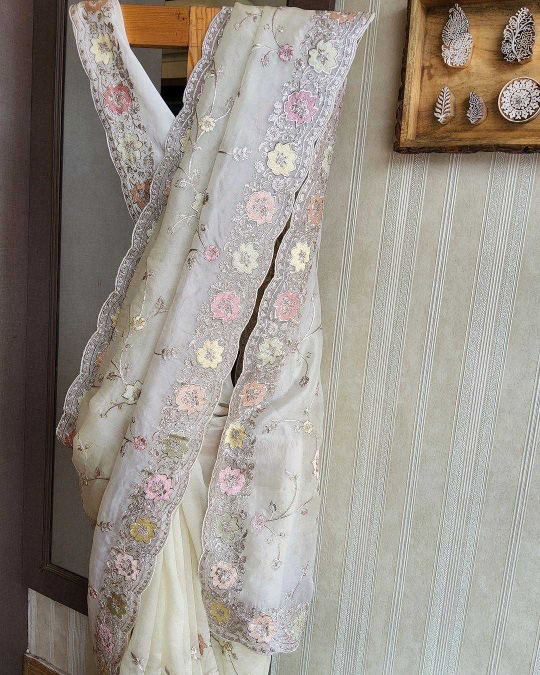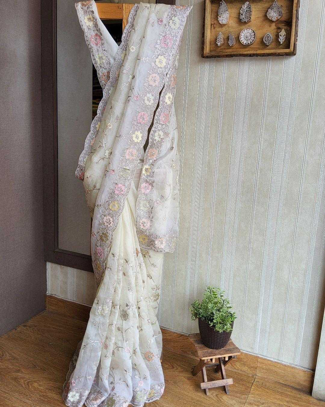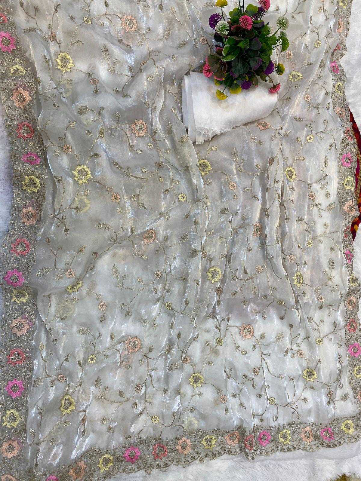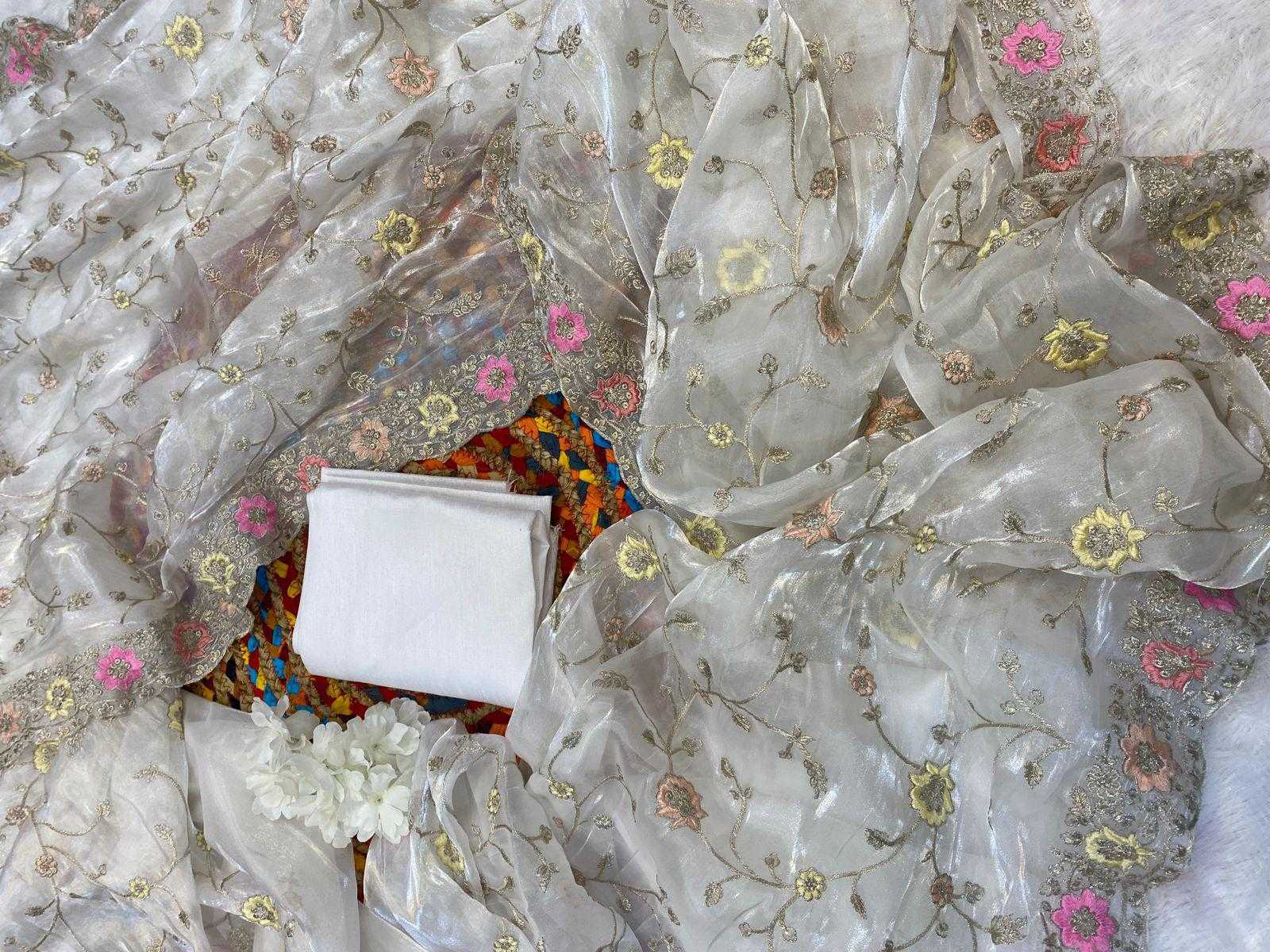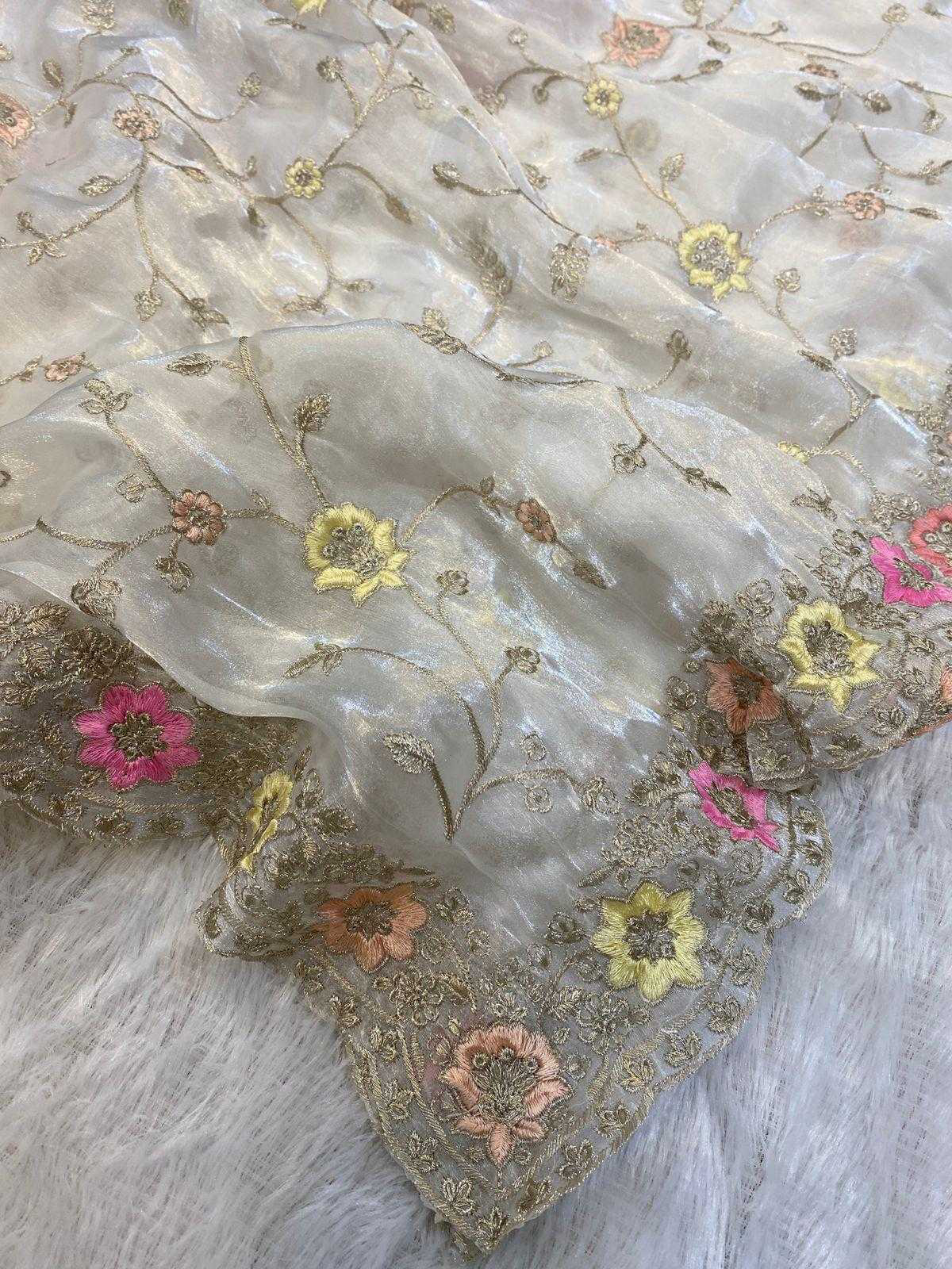 *Descriptions :* Embrace yourself with this pure white Orra around you with all the purity here’s White beauty of 6 yards of jimmyChoo fabric delicately crafted with multicolored thread and zaridori embroidery in floral motifs comes with an abstract cutwork heavily embellished border This peice of beauty comes with a pure white silk blouse