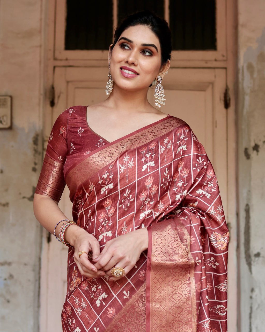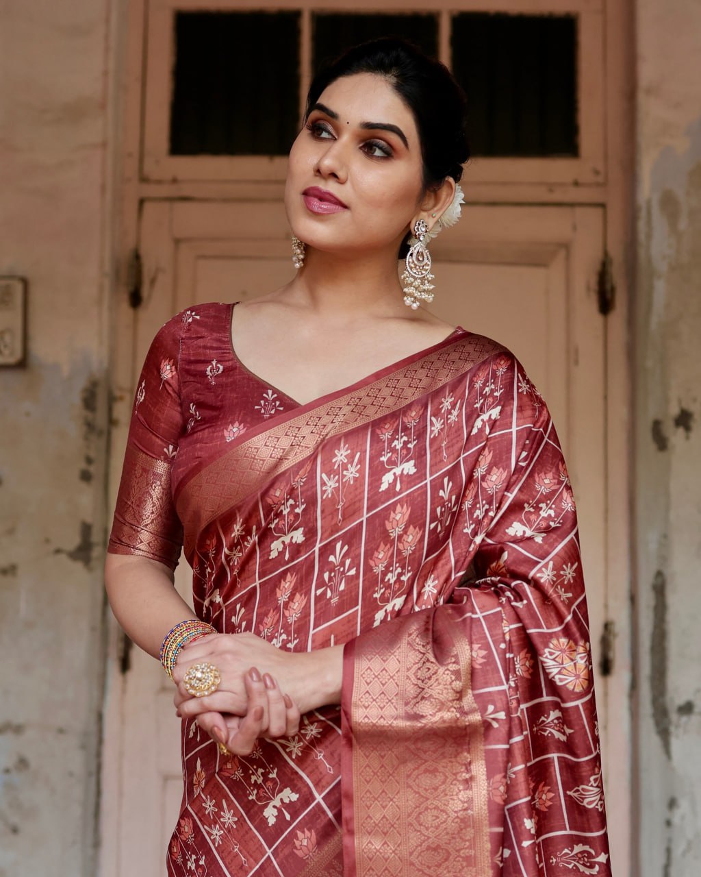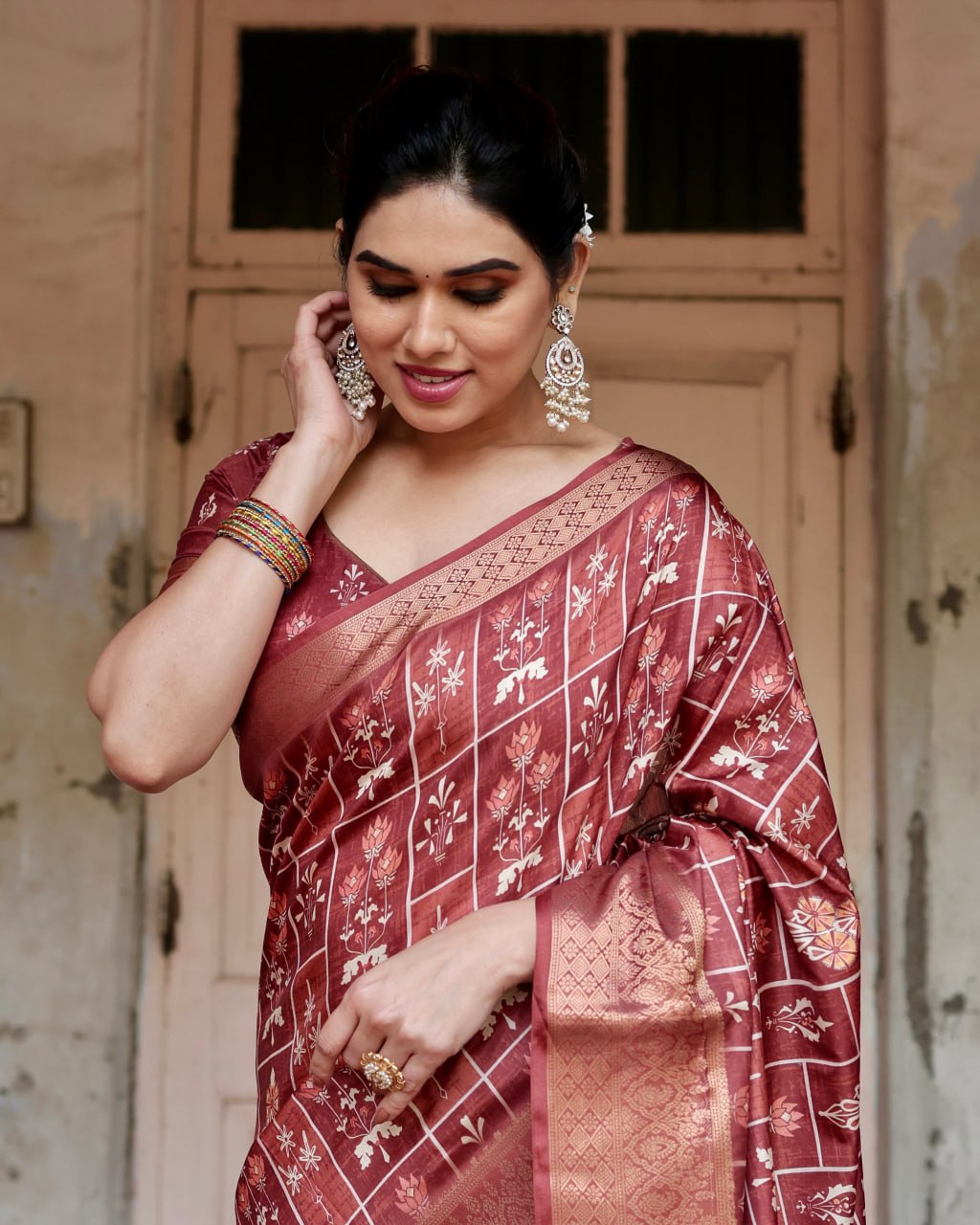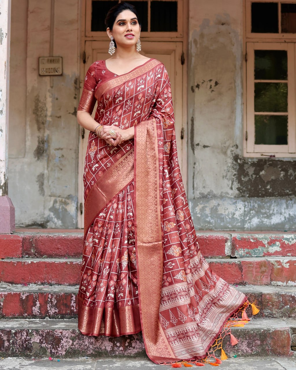 Pure Silk Digital Printed Saree, Exuding Regal Charm With Its Rich Pallu And Intricate Brocade Blouse, Elegantly Adorned With Enchanting Tassels On The Saree’s Edge.