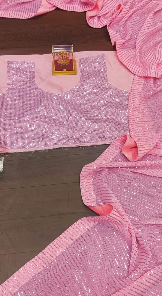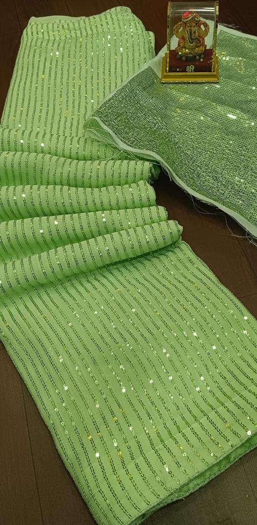 This elegant saree is a lovely choice for any occasion. The georgette fabric is smooth and comfortable, and the beautiful finishing piping border adds a touch of sophistication. The saree is adorned with 3mm sequence work that sparkles and shines in the light. The blouse is also made of georgette and has the same sequence work as the saree. The blouse is unstitched and can be customized according to your preference.