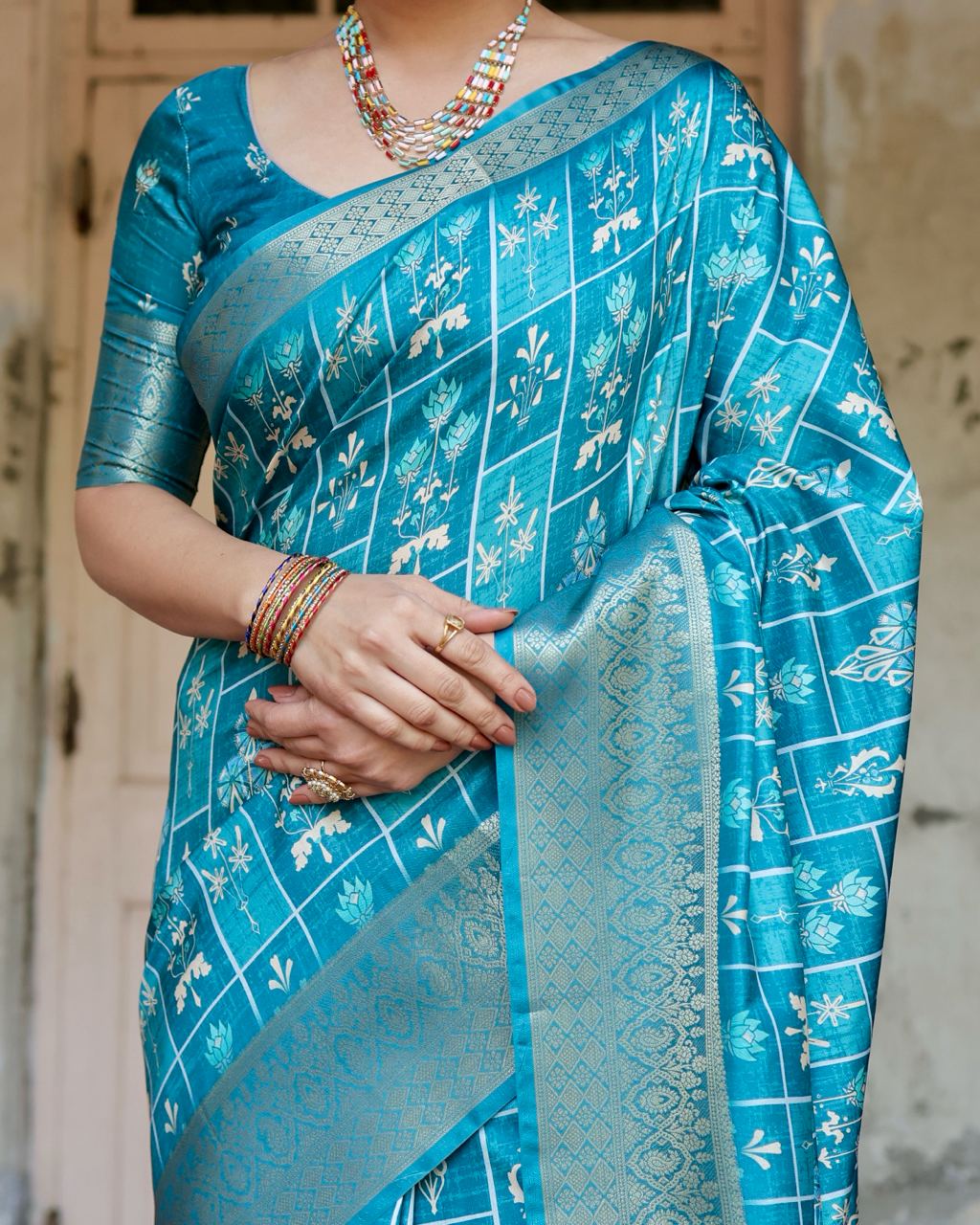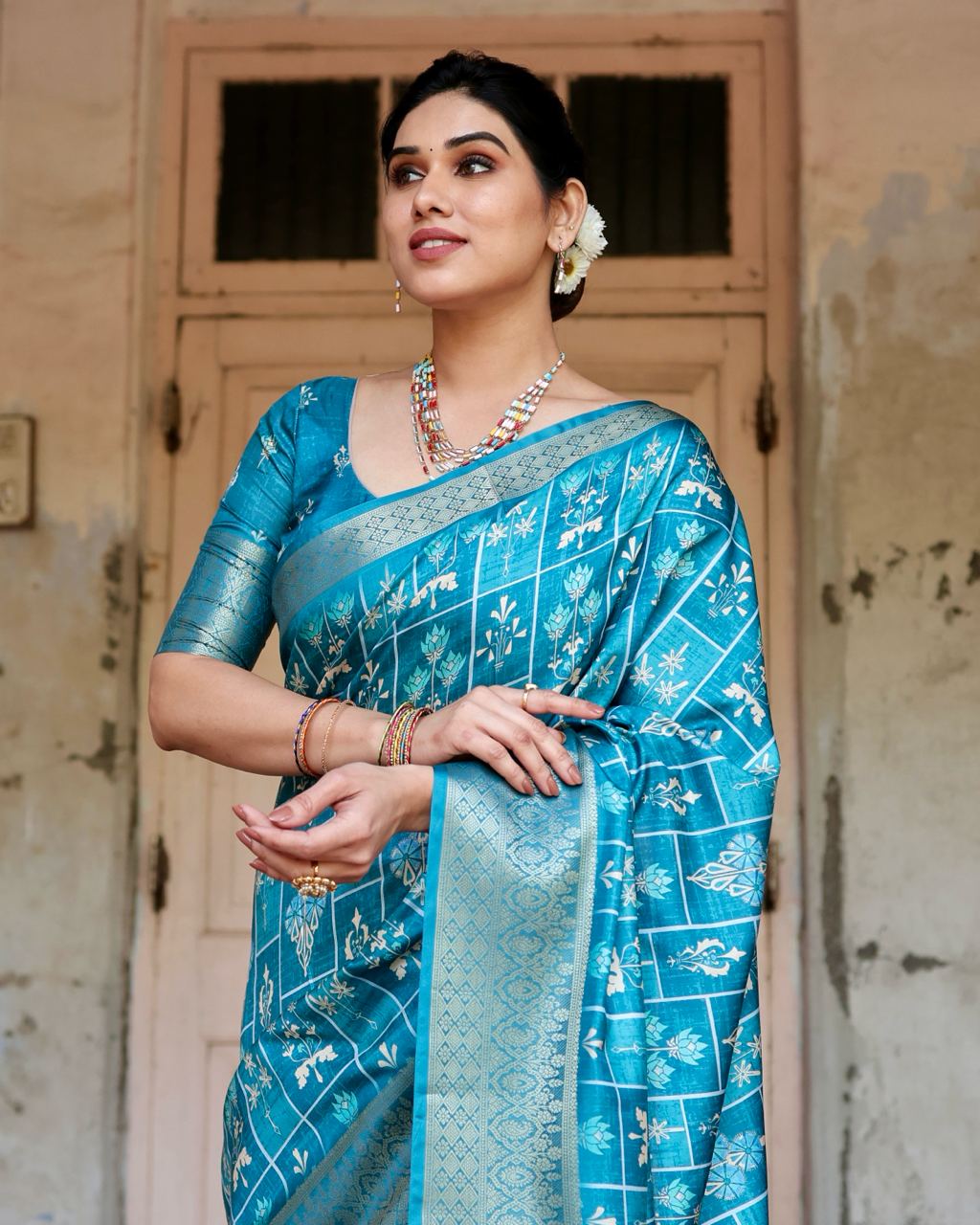 Pure Silk Digital Printed Saree, Exuding Regal Charm With Its Rich Pallu And Intricate Brocade Blouse, Elegantly Adorned With Enchanting Tassels On The Saree’s Edge.